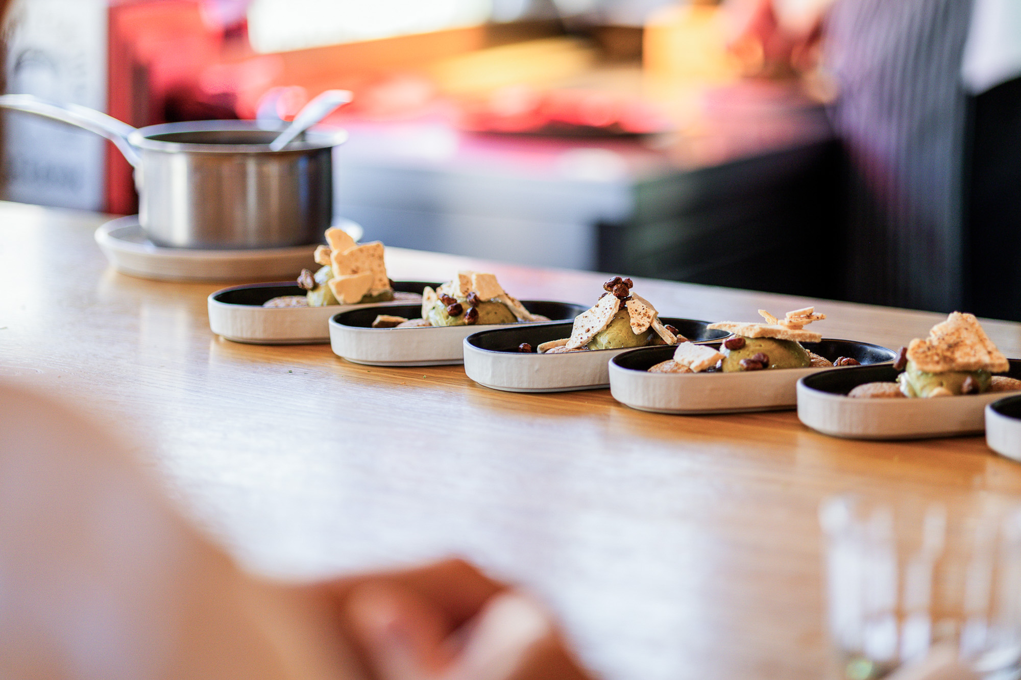 After a five-minute walk, we arrive at our restaurant, where a young, dynamic and relaxed team is ready to showcase their cooking techniques. You’ll have the chance to ask questions and satisfy your curiosities at any time. This is, in fact, a showcooking, a live culinary demonstration.